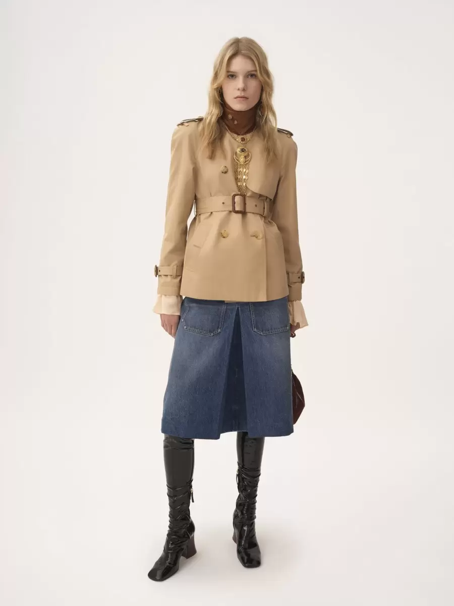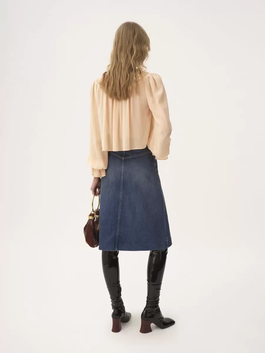 Knee-length skirt in broken blue organic cotton denim with Chloé-engraved buttons, oversized patch pockets with diagonal zippers, and a front box pleat.