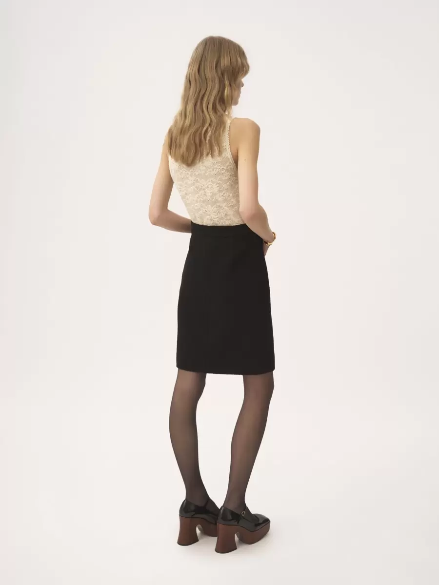 Tailored knee-length skirt in wool bouclette with front flap pockets and gold-tone buttons.