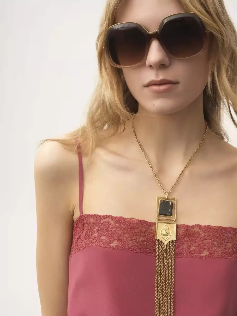 Fluid camisole top in organic silk crêpe de chine, featuring thin straps and lace inserts along the neckline.