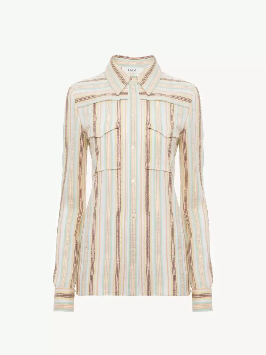 Fitted shirt in textured, striped crêpon cotton with flap chest pockets and mother-of-pearl buttons.