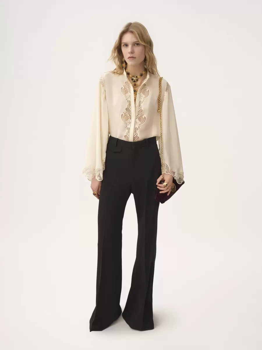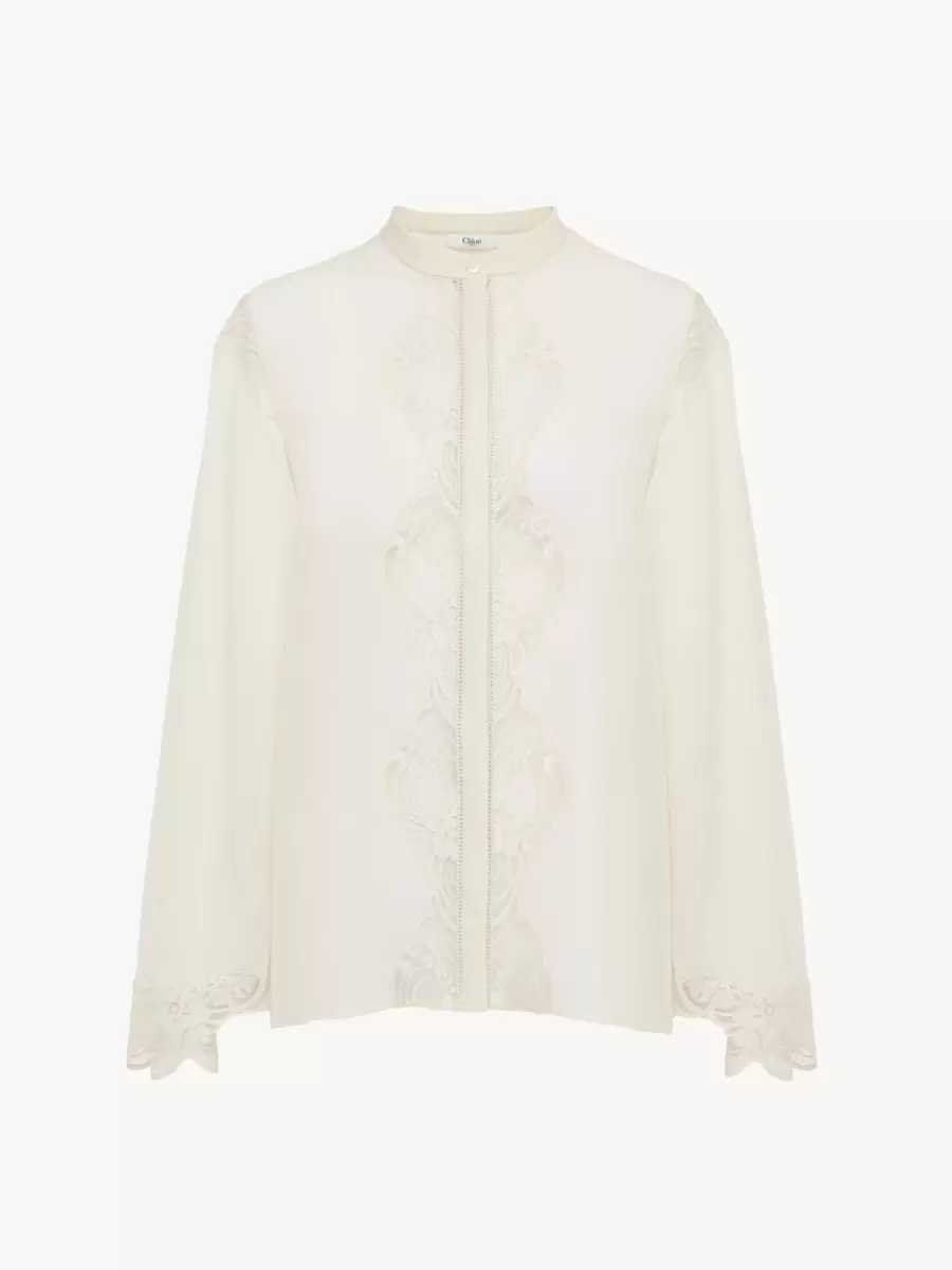 Fluid blouse in organic silk georgette, featuring lace trims, jour échelle inserts, and mother-of-pearl buttons.