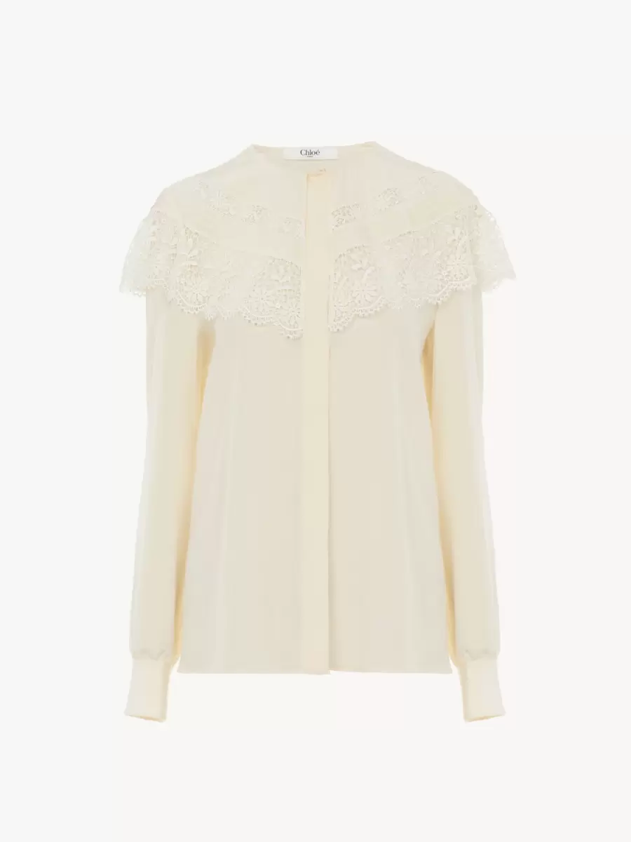 Round-neck gathered blouse in organic silk crêpe de chine with a lace-trim collar and mother-of-pearl buttons.
