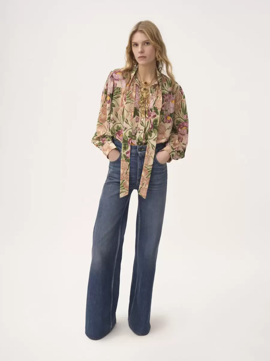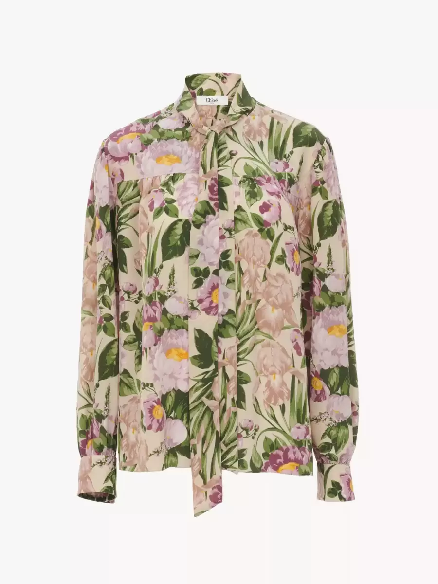 Maxi gathered lavallière blouse in organic silk crêpe de chine with a floral print and a fluid silhouette.