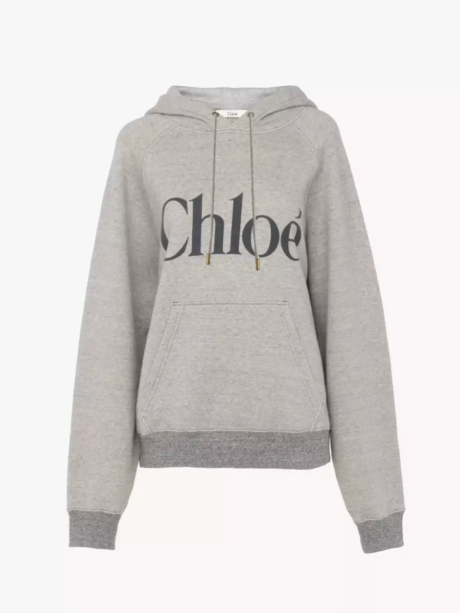 Oversized hoodie in a chiné cotton fleece mix with a large Chloé logo print at the front. A pouch pocket, contrast ribbed trims and a drawstring hood with Chloé-engraved metal tips finish this piece.