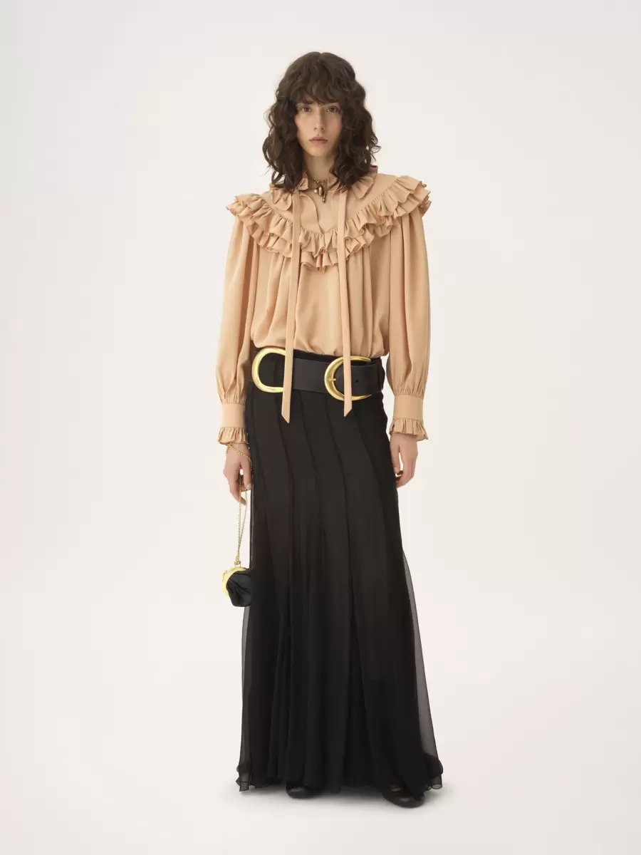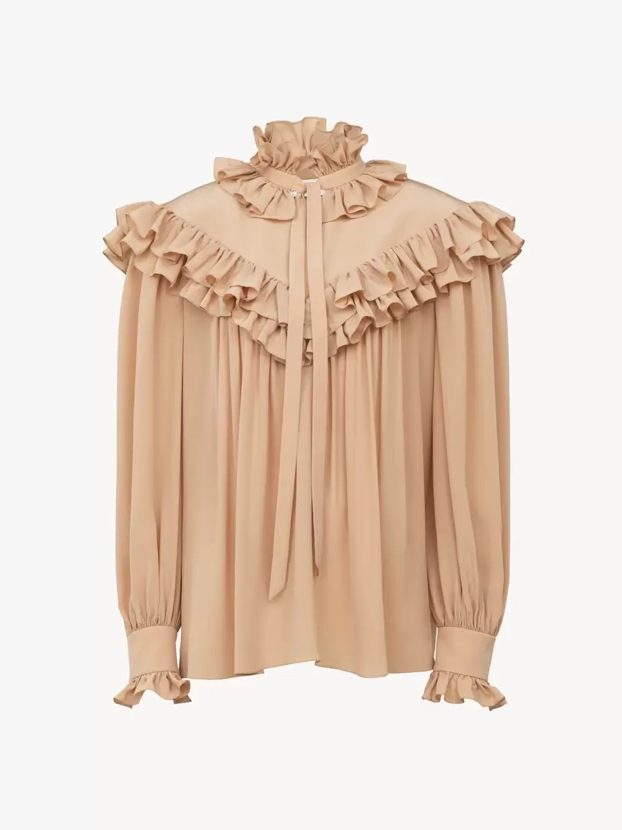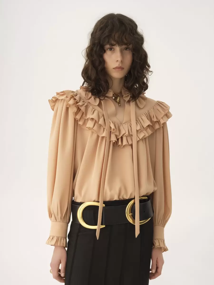 Oversized gathered ruffle top in organic silk light crêpe de chine, featuring a neck tie and gold-tone buttons at the cuffs.