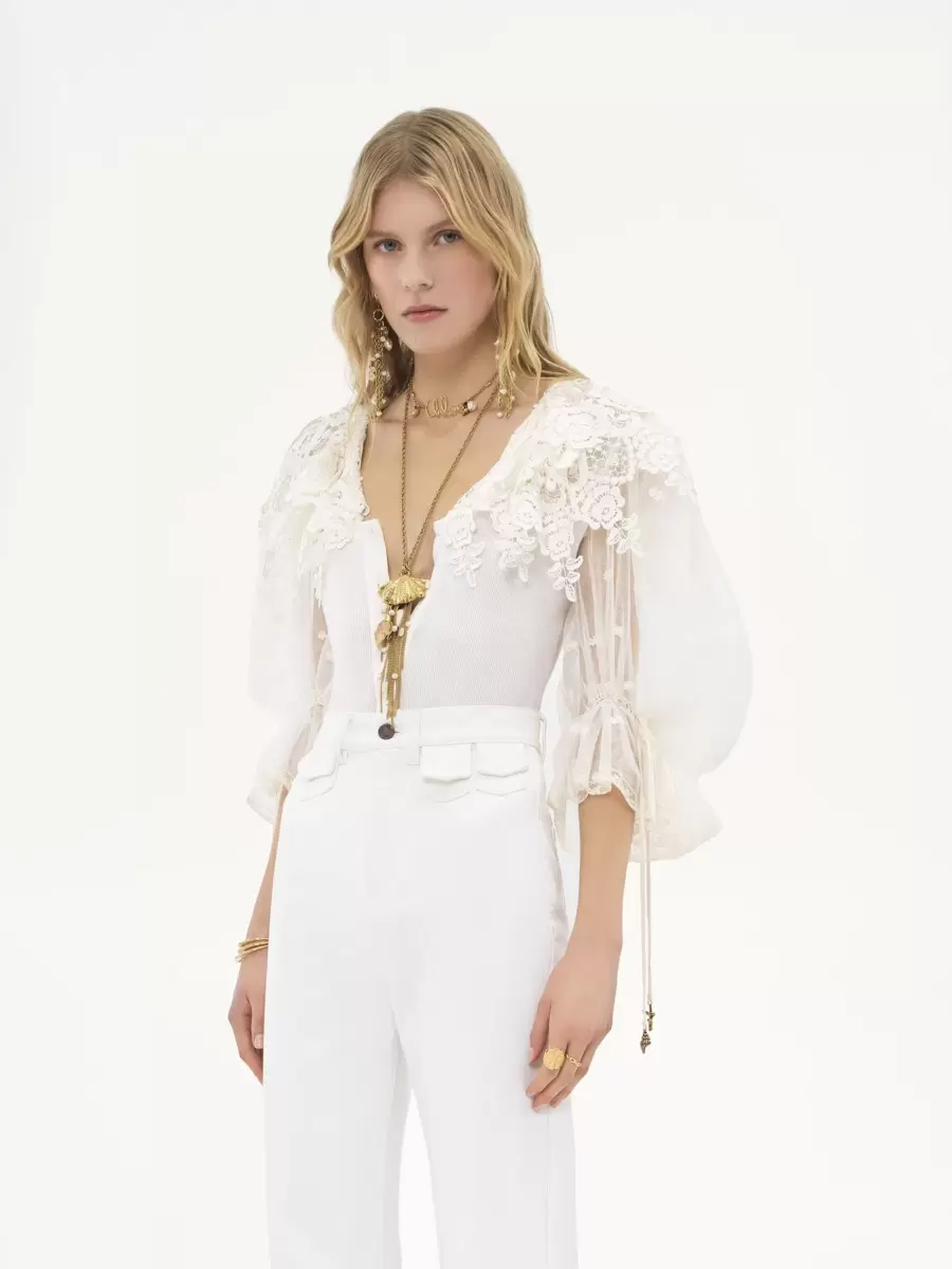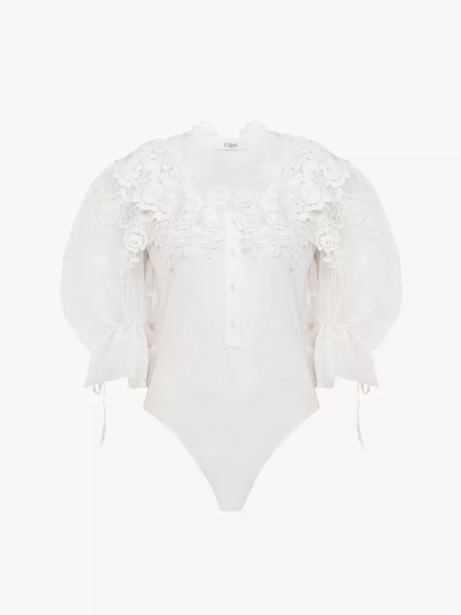 Fitted bodysuit in a guipure lace organic cotton mix, featuring sheer puff sleeves and a guipure trim rooted in the Maison’s heritage. Mother-of-pearl buttons and dangling ties with gold-tone charms finish this piece.