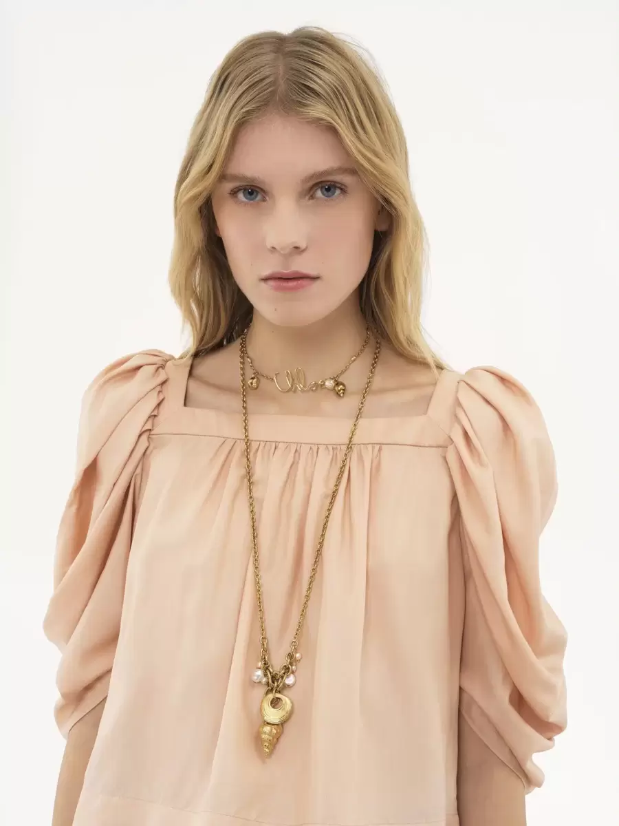 Puff-sleeve pleated top in silk poplin with a square neckline and a fluid silhouette.