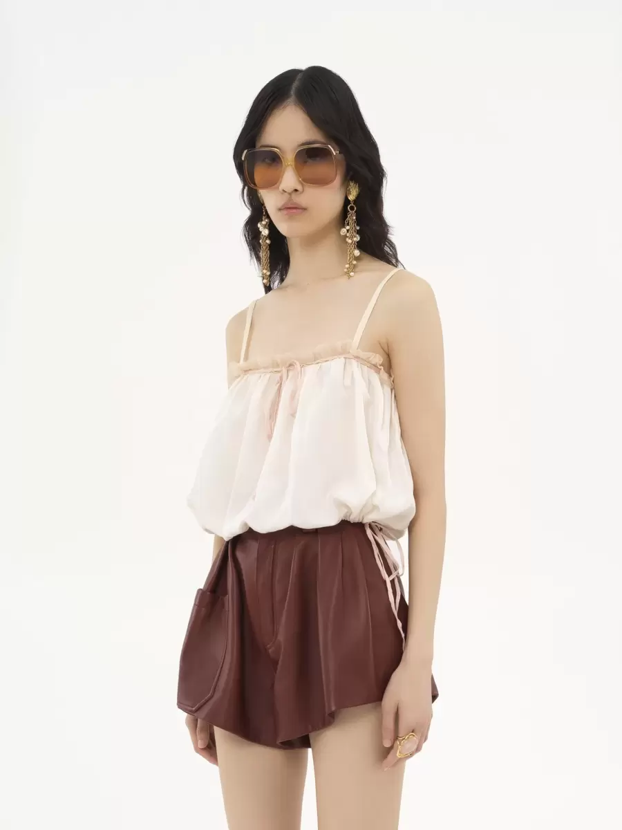 Ruffled camisole top in soft silk habotai with a drawstring neckline and waist, thin straps and ruffle trims.
