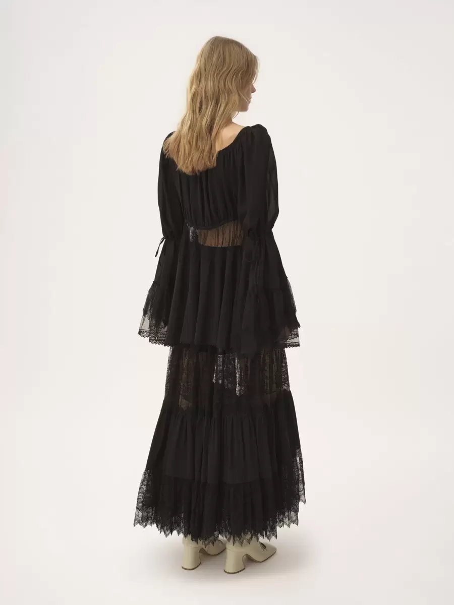 Puff-sleeve ruffle top in organic silk georgette with a separate lining and lace inserts at the waist and cuffs. Drawstring ties gather the scoop-neck silhouette, while fabric-covered buttons detail the left side.