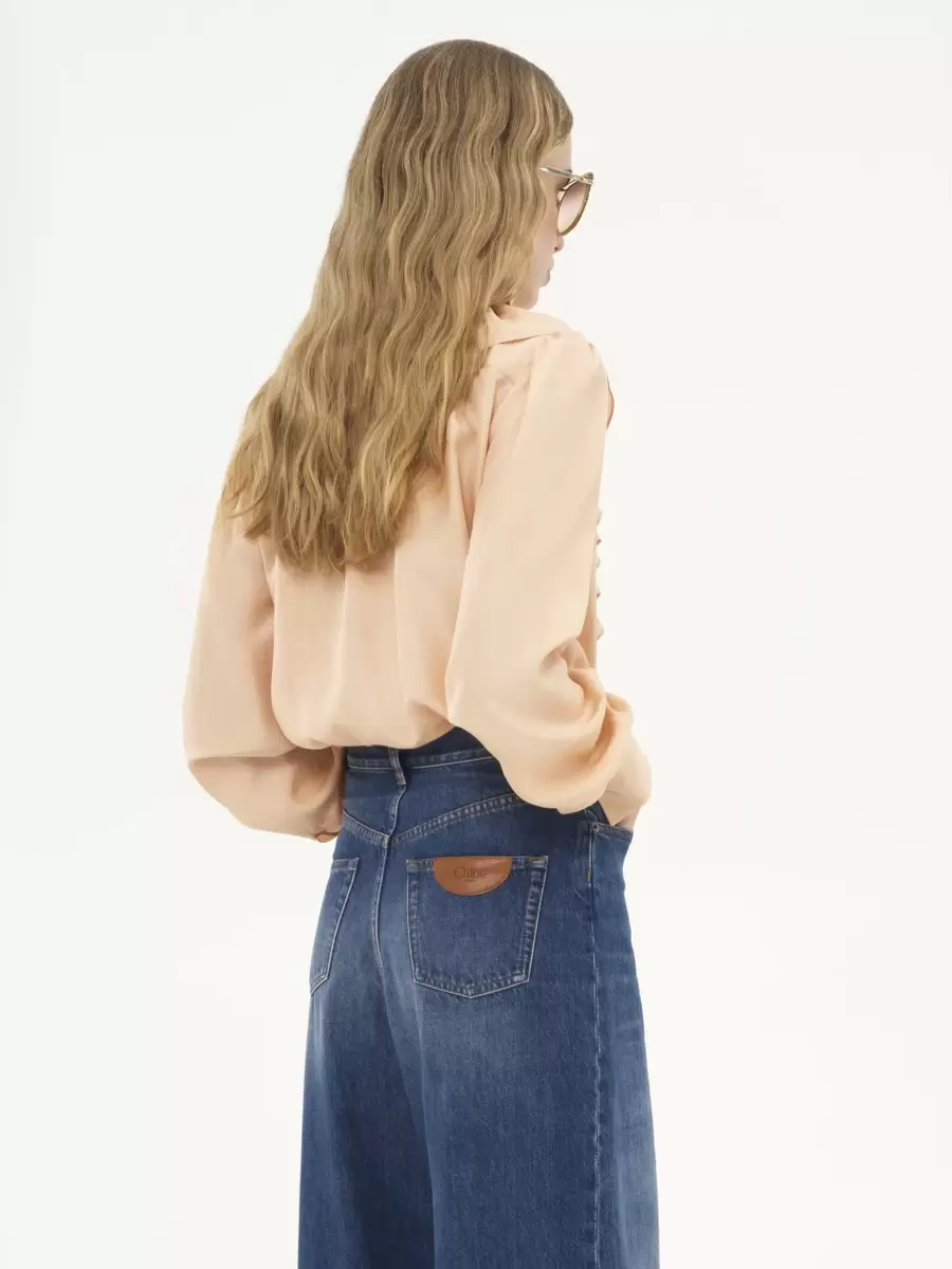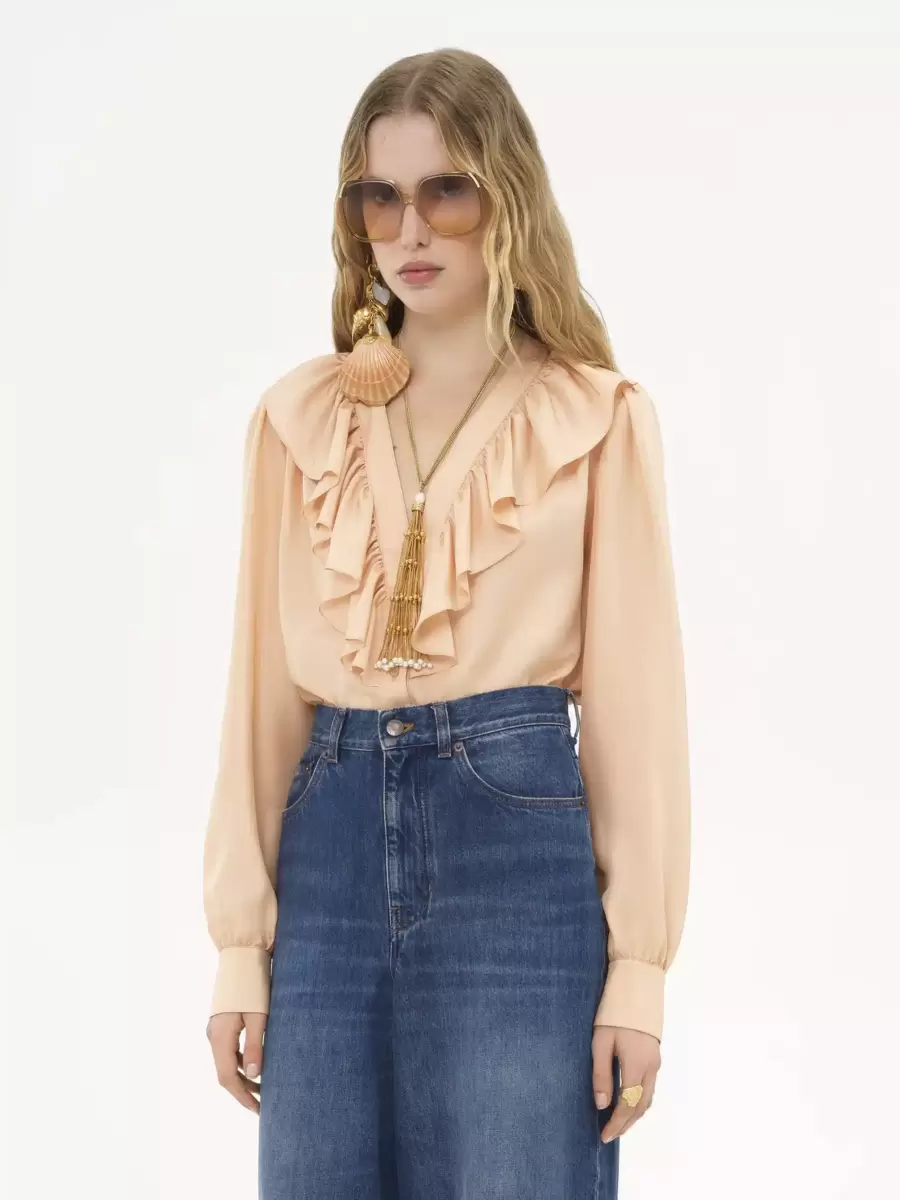 V-neck ruffled blouse in soft silk habotai with gathered details and flounces along the neckline.