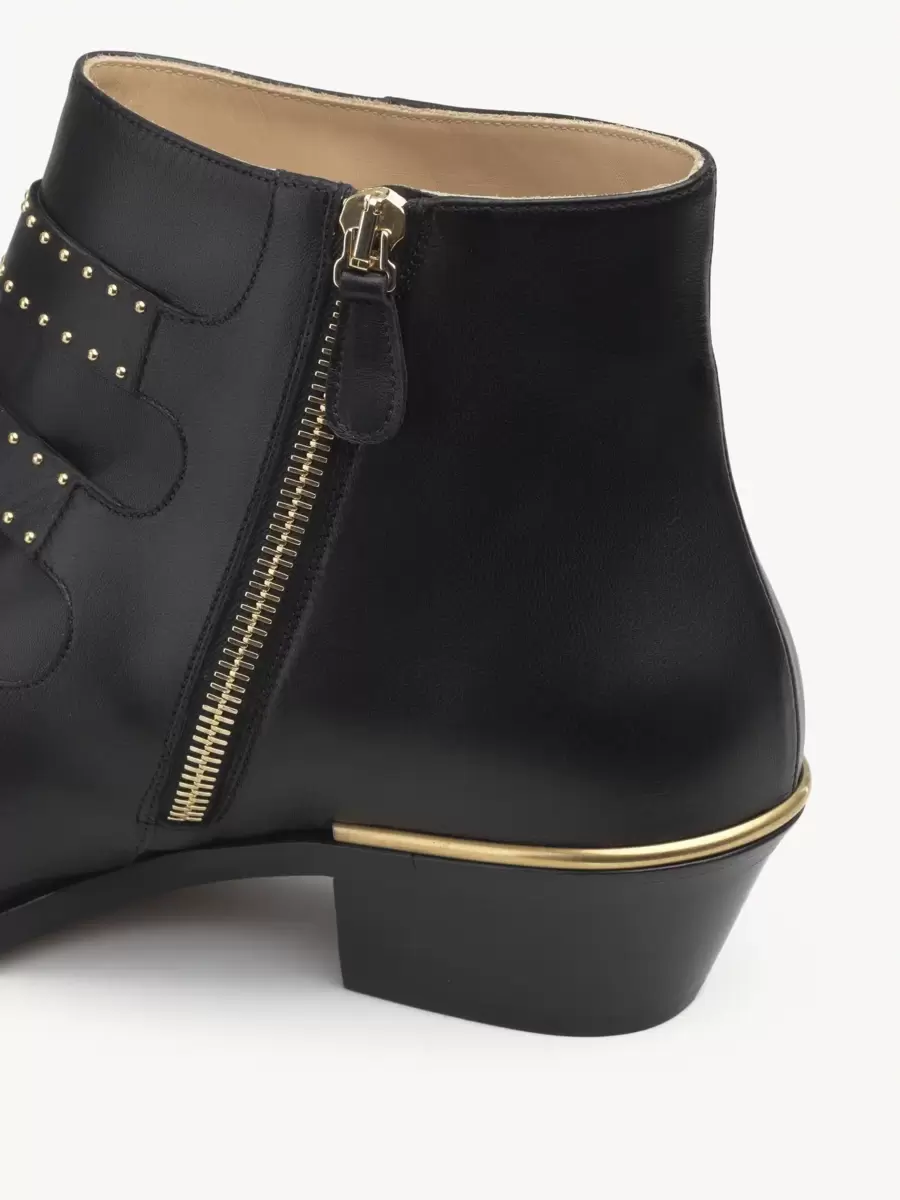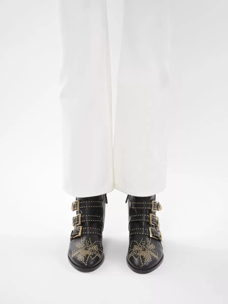 The statement Susanna short boot perfectly captures the Chloé girl’s rock ‘n’ roll attitude. The glossy finish of the smooth and supple nappa sheepskin adds femininity, complementing the glamour of the vintage buckles and the emblematic studs.