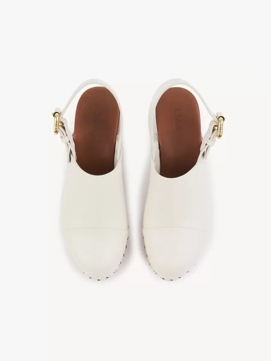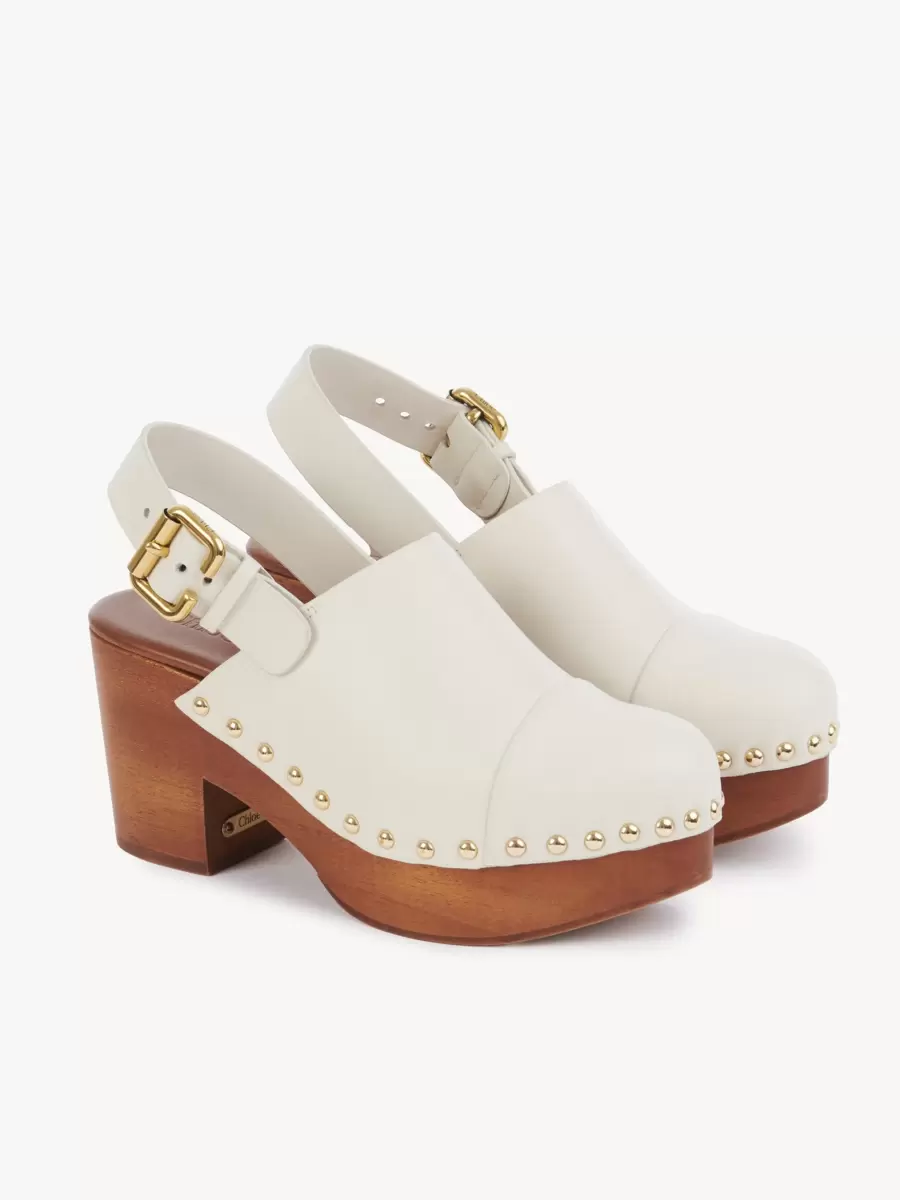 Gold-tone studs and a Chloé-branded plate add contrasting hardware, while the Maison’s Paddington buckle finishes these wedge clogs.