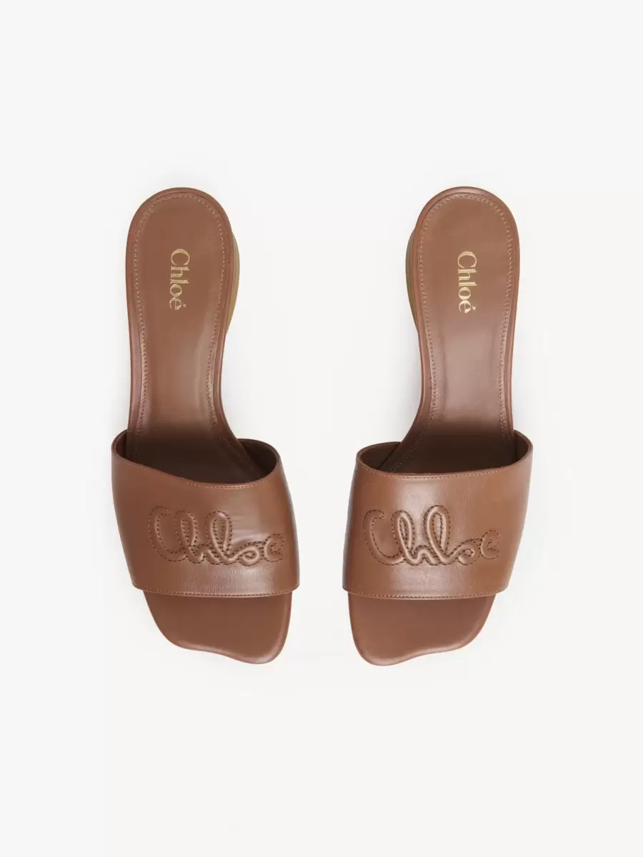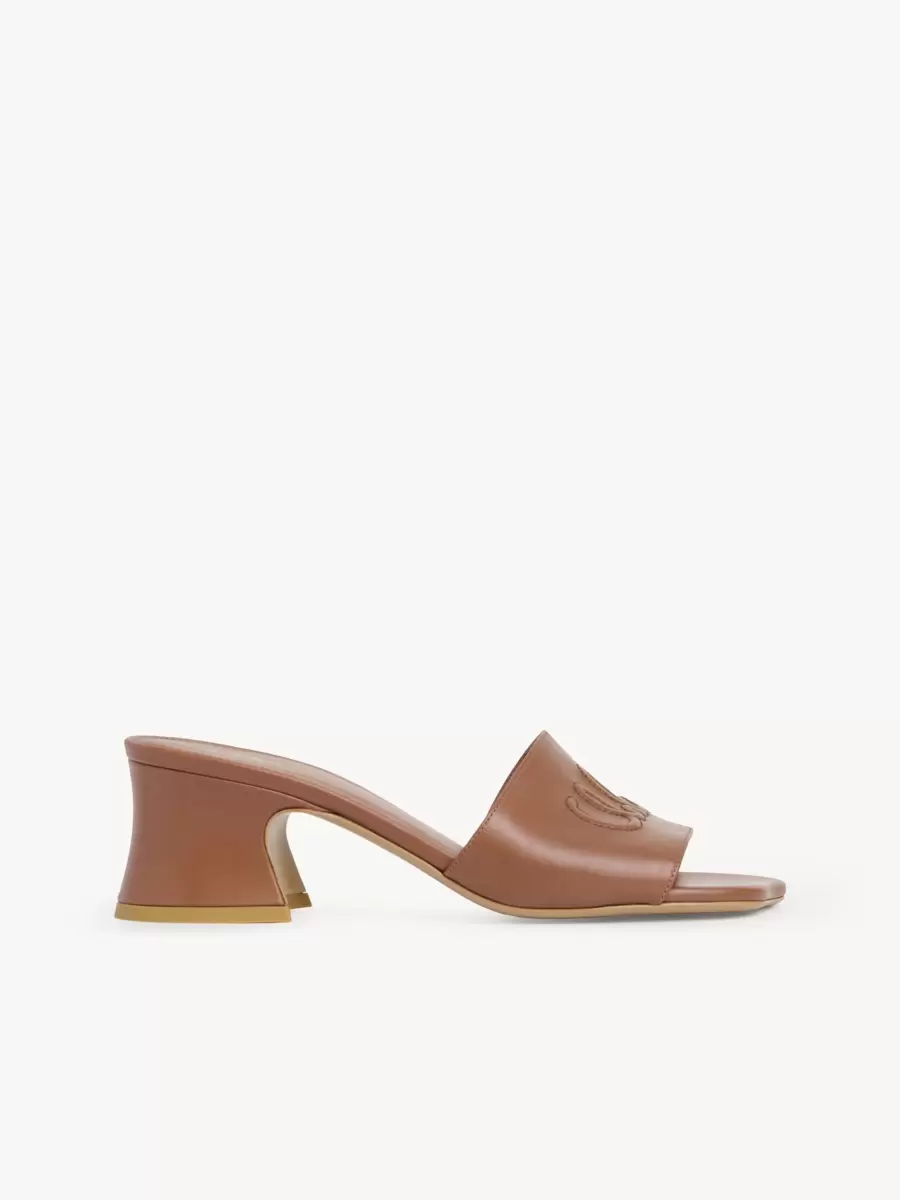 Crafted from shiny calfskin, the Chloé Soleil heeled mules combine a flared block heel with a distinctive wavy sole. The upper is stitched with the Chloé Iconic logo.