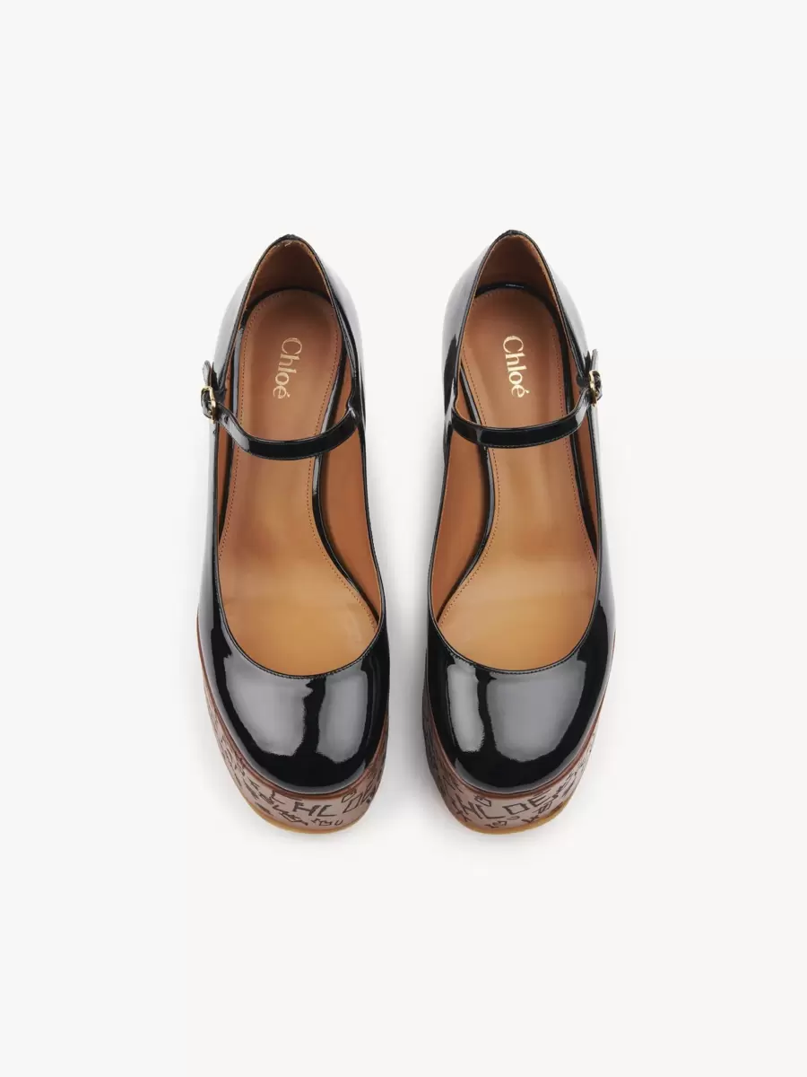 The Maxime wedge pumps feature a Mary Jane upper in patent calfskin, set on a wood-effect platform structure.