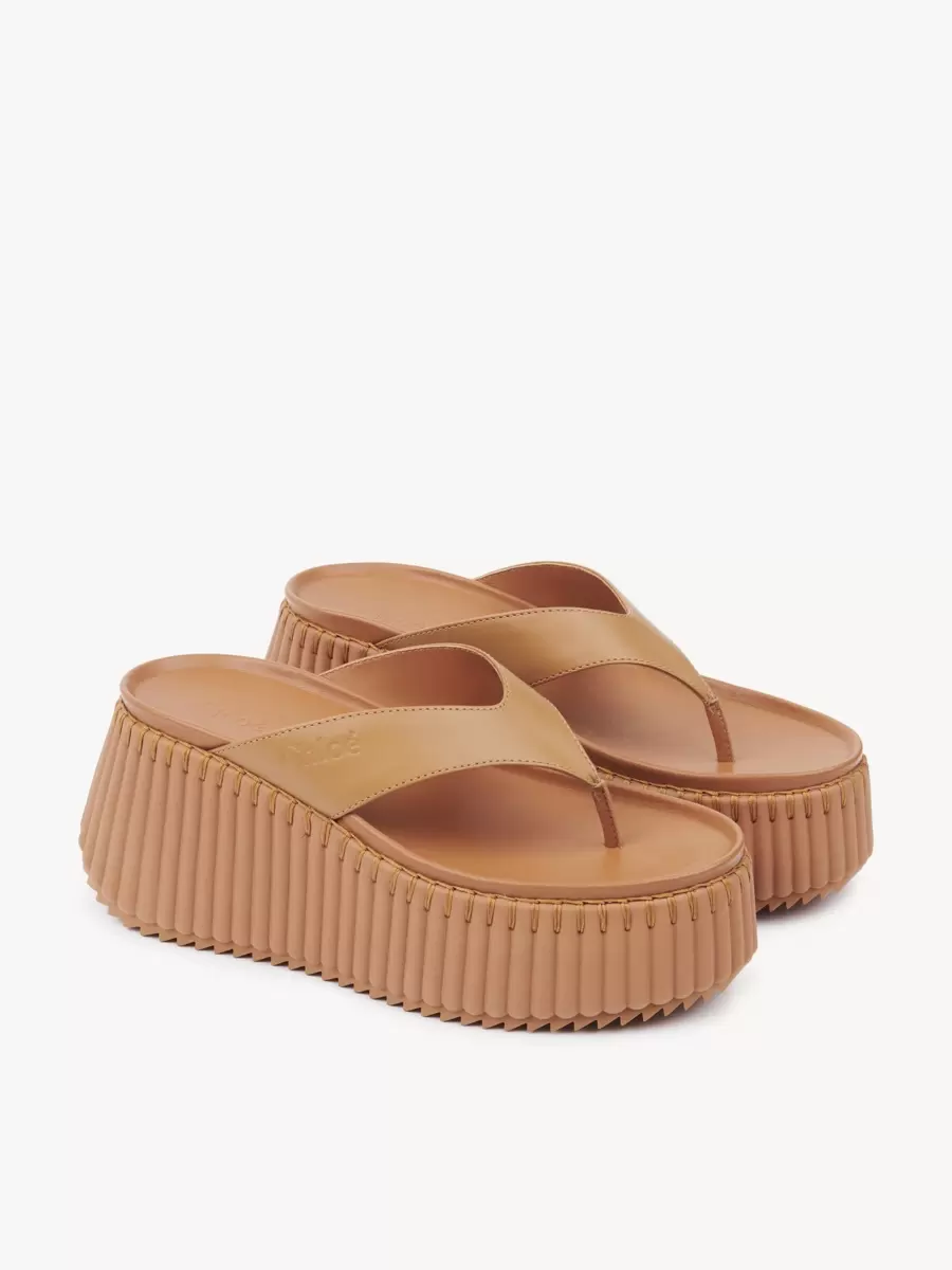 Crafted from calfskin, these Nama wedge slides feature a thong front debossed with the Chloé logo. They are set on an iconic, lightweight and ultra-comfortable recycled platform, finished with immaculate tonal blanket stitching which takes 4.5 hours to complete by hand.