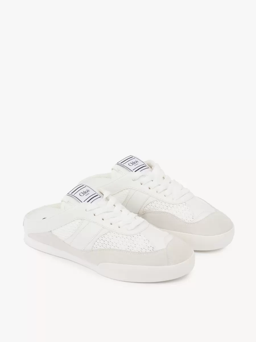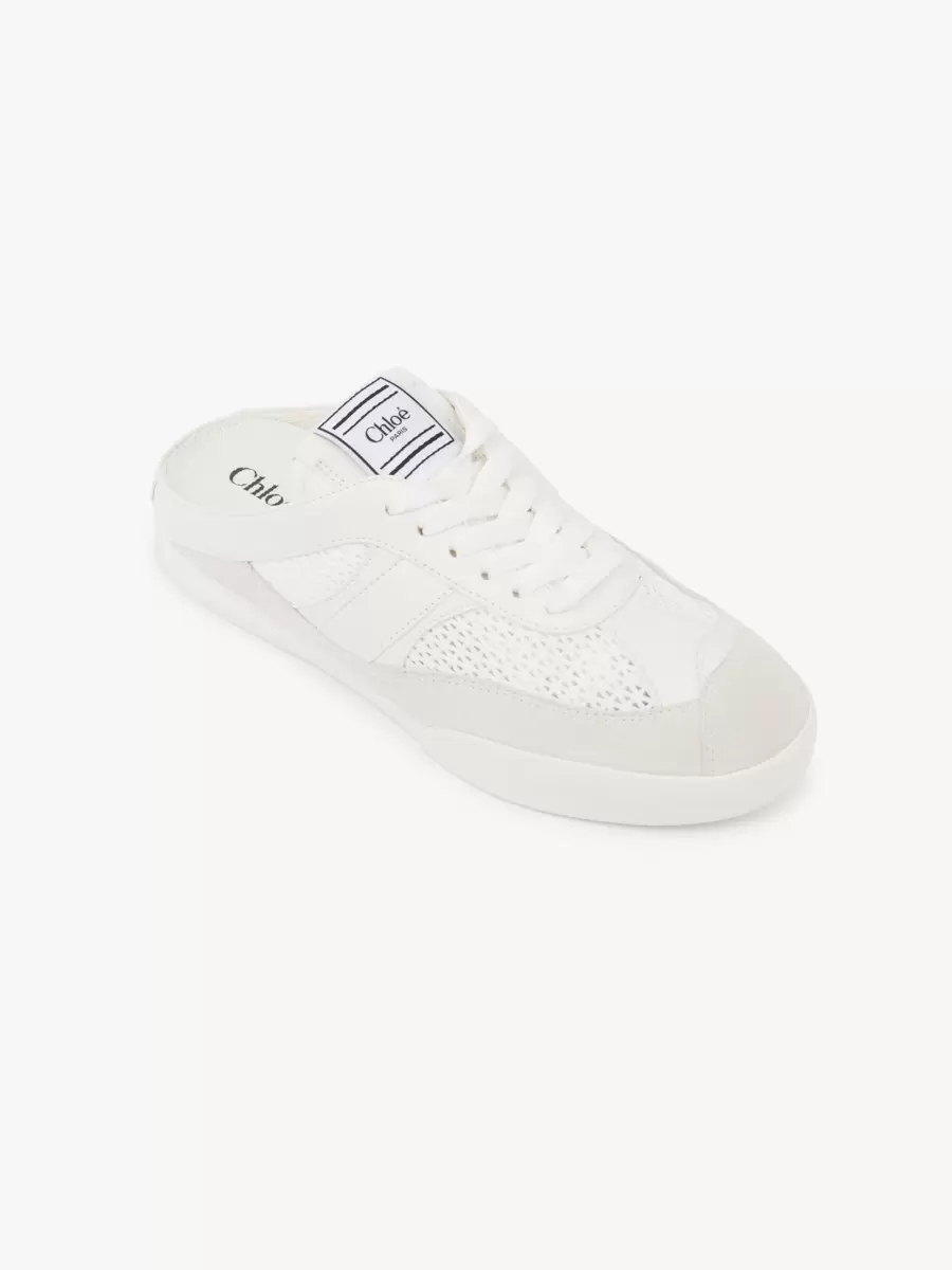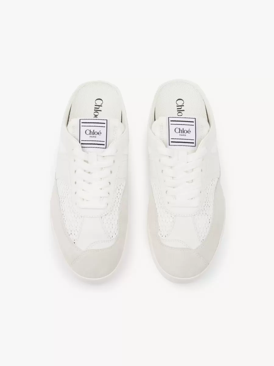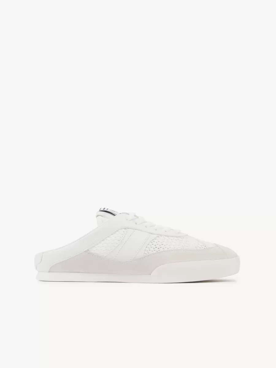 Inspired by the ballet and boxing worlds, these Chloé Kick sneaker mules reinterpret the line’s classic sneaker in recycled mesh and smooth and suede calfskin.